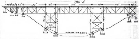 The total length of steel works is 780 ft. 8 ins., the approach at the east end being 28 bents of the C.N.R. standard framed timber trestle 68 ft. in height. The river span is 216 ft. long, supported on steel towers on concrete pedestals, the span of these towers being 60 ft. The east and west flanking spans are respectively 162 and 135 ft. long, and the western approach is of viaduct construction.