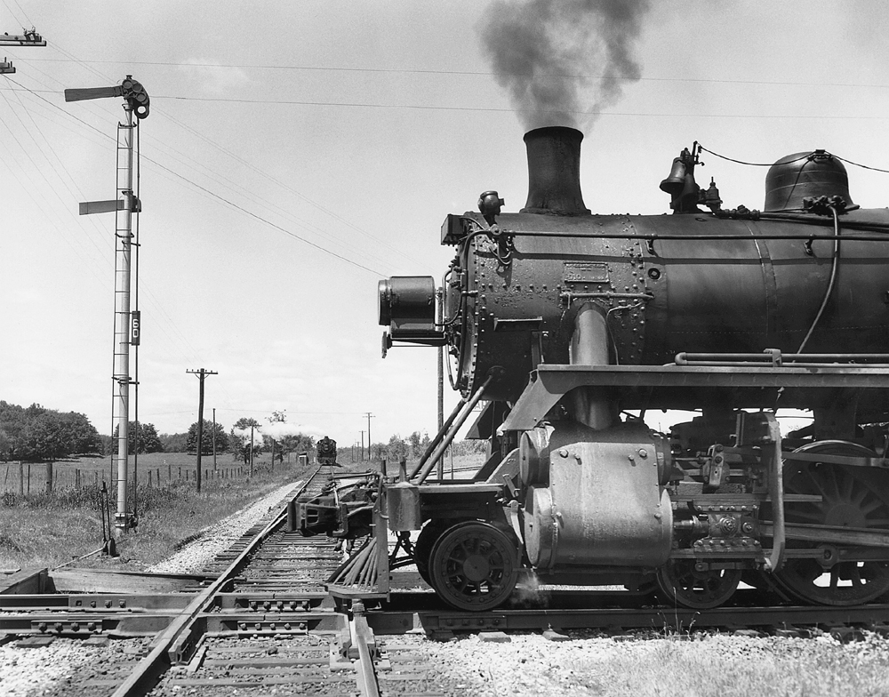 Semaphore No. 60 holds C.N.Rys. Pacific 5563 with southbound ballast extra at the stop sign on Southampton Subdivision while C.P.Ry. Ten Wheeler 1004 crosses Owen Sound Subdivision with the Teeswater Mixed. The Owen Sound Subdivision continues through the diverging (righthand) leg of the turnout north of the diamond.