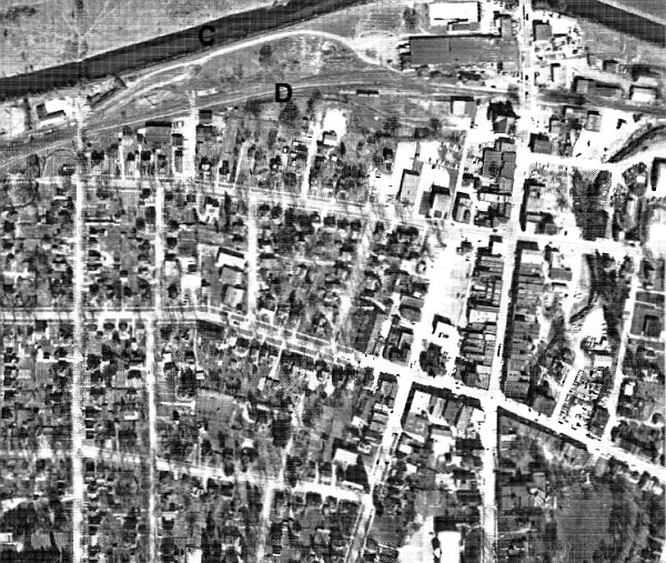 Air photograph showing the former Canadian National Railways motive repair plant (upper left hand corner at A), Station Park (B), the 1913 station with its tower removed (C), and the railway yards (D) as photographed in 1986-07. (Canada, Ministry of Energy, Mines and Resources, EMR A-26976-133.)RSR-200, Figure 25.