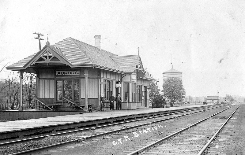 Postcard view of Aurora station in the G.T.R. era. Published by Herrington & Son, Photos, Trenton. Postmarked Aurora, August, 28 [illegible].