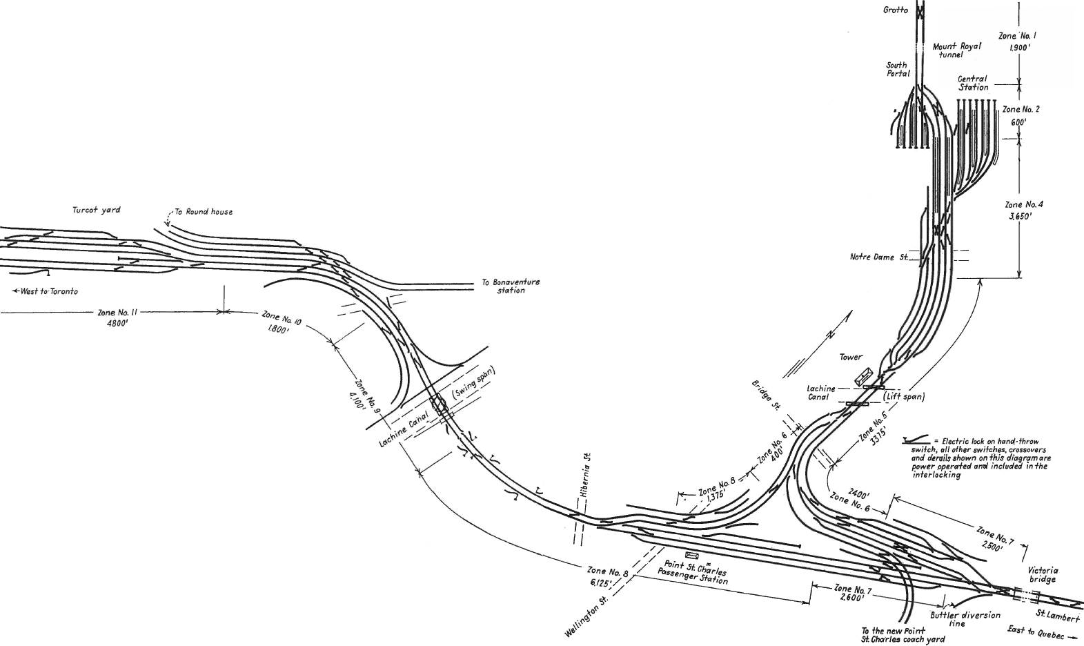 JPS collection The [Montréal terminal] interlocking includes 9 road miles, involving 28 track miles, and is divided into 11 zonesRailway Age, 116(4), 1944-01-22, pp. 232-233.