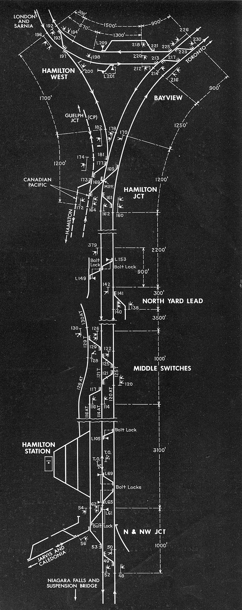 Terminal interlocking at Hamilton handles an average of 52 passenger and 37 freight trains daily. Turnouts are No. 28 [this is not correct], which are good for 28 mph. Speed is restricted to 20 mph Hamilton West to Bayview (descending 1 per cent grade), and elsewhere in the plant to 35 mph.Railway Age, 145(16), 1958-10-20, p. 27.