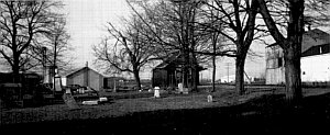 Early photographs show a grain elevator directly across the tracks from the station (Figure 23). A landmark wooden water tower for many years stood just to the south of the station, adjacent to several other railway structures, including a substantial freight shed (Figure 22) and several sidings.46 To the east and west of the station, the railway's right-of-way remained open, in a largely agricultural setting. One anomaly, from the outset, was the proximity to the station of a tree-lined pioneer graveyard, only a few yards away to the southeast, adjacent to the tracks. This unlikely juxtaposition continues to lend a quiet dignity to the otherwise utilitarian environment of the station (Figure 24).